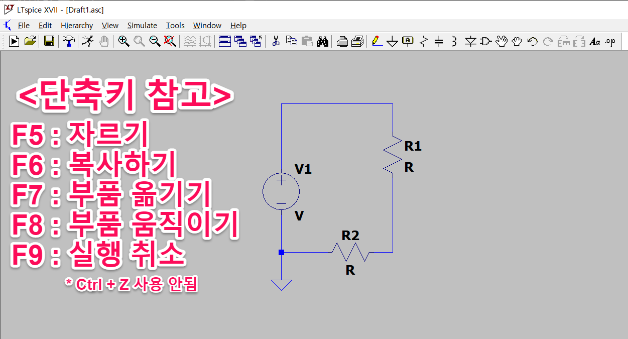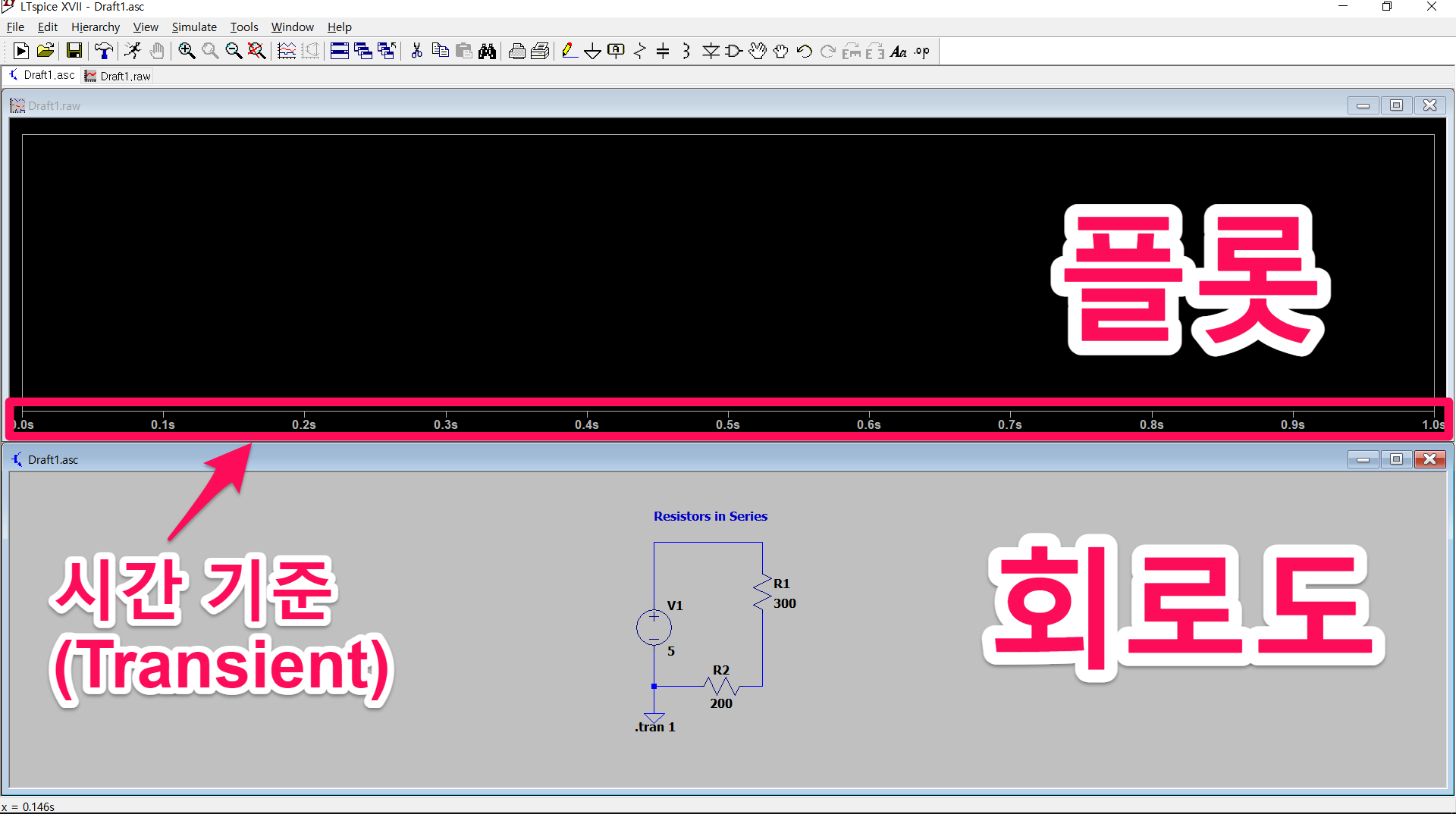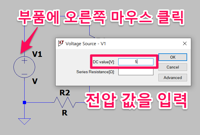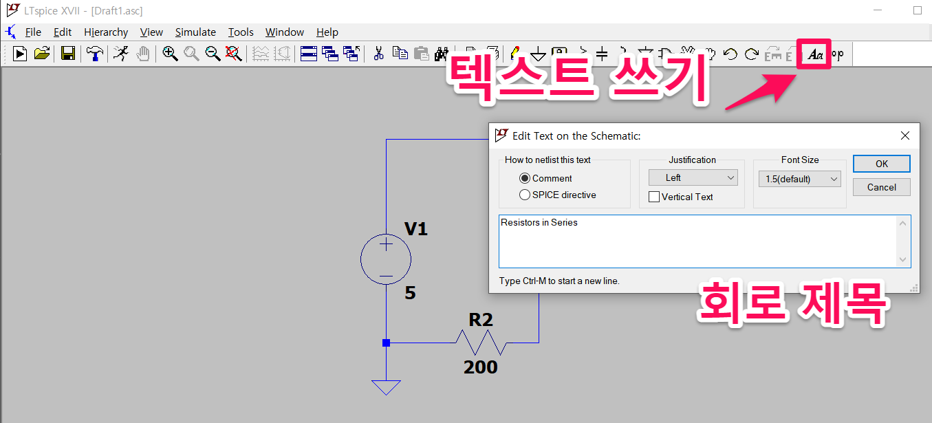 간단한 직렬 연결 저항 회로를 시뮬레이션 해보겠습니다.