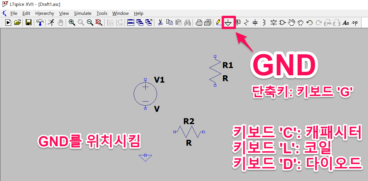 위쪽 메뉴에 GND를 클릭하거나 키보드 'G'를 눌러 GND를 위치시킵니다.