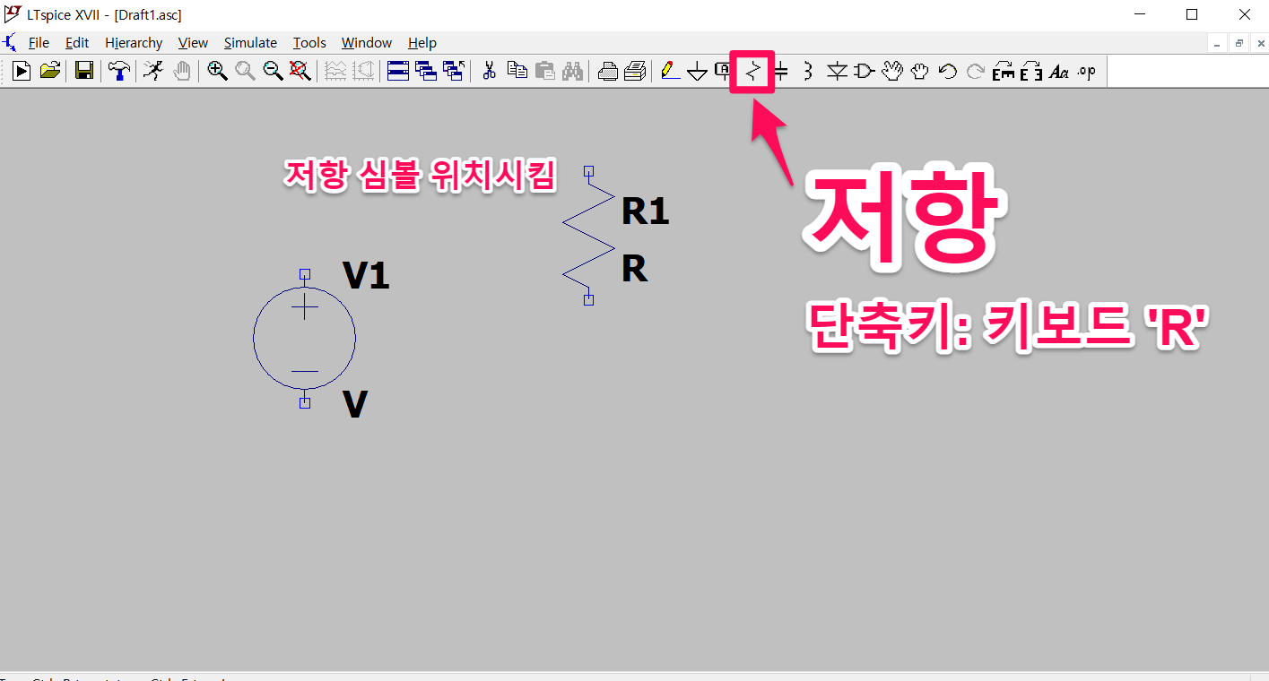 위쪽 메뉴에 저항을 클릭하거나 키보드 'R'를 눌러 저항을 위치시킵니다.