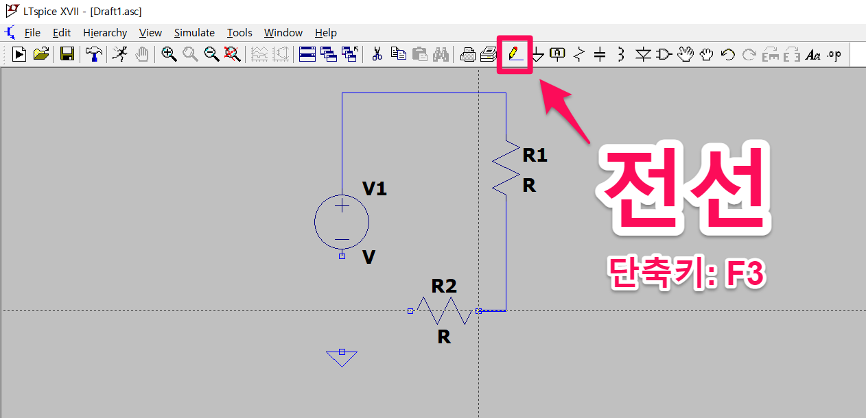 위쪽 메뉴에 연필모양을 클릭하거나 'F3'을 눌러 전선을 연결해줍니다.