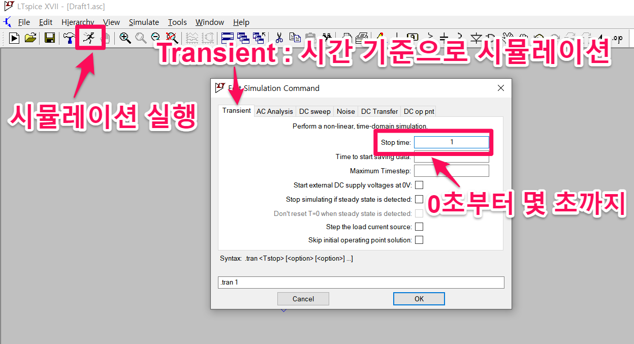 Transient 시간 기준으로 0초부터 1초까지 시뮬레이션을 진행하겠다고 설정합니다.