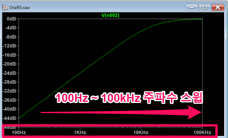위의 회로도에서 V1의 AC 전원 주파수를 100Hz에서 100kHz 스윕해봅니다.