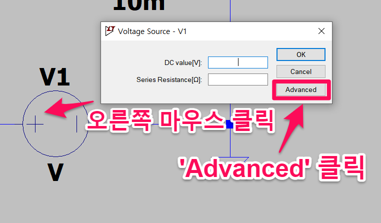 위의 회로에서 V1을 AC 전원으로 설정해보겠습니다.
